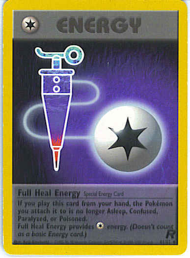If you play this card from your hand, the Pokemon you attach it to is no longer Asleep, Confused, Paralyzed, or Poisoned. Full Heal Energy Provides 1 Colorless energy. (Doesn't count as a basic Energy card.)