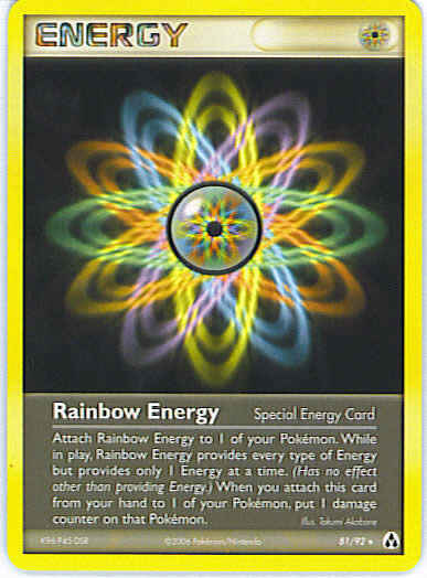 Evne Attach Rainbow Energy to 1 of your Pokemon. While in play, Rainbow Energy provides every type of energy but provides only 1 energy at a time. (Has no effect other than providing energy.) When you attach this card from your hand to 1 of your Pokemon, put 1 damage counter on that Pokemon.