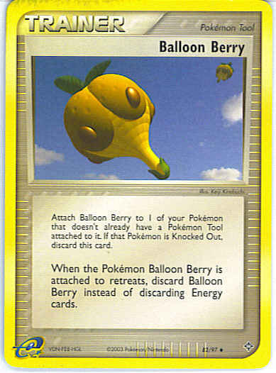 Attach Balloon Berry to 1 of your Pokemon that doesn't already have a Pokemon Tool attached to it. If that Pokemon is Knocked Out, discard this card. When the Pokemon Balloon Berry is attached to retreats, discard Balloon Berry instead of discarding Energy cards.