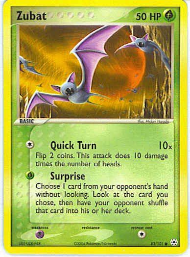Type | Grass | Pokemon serie | Hidden Legends | Stadie | Basic | HP | 50 | Sjældenhed | Common | Tilbagetrækning | 1 | Svaghed | P | Kortnummer | 83 | Evne | [C] Quick Turn (10x) Flip 2 coins. This attack does 10 damage times the number of heads. [G] Surprise - Choose 1 card from your opponent's hand without looking. Look at the card you chose, then have your opponent shuffle that card into his or her deck. | Evne2 | [C] Quick Turn (10x) Flip 2 coins. This attack does 10 damage times the number of heads. [G] Surprise - Choose 1 card from your opponent's hand without looking. Look at the card you chose, then have your opponent shuffle that card into his or her deck. | Kunstner | Midori Harada |