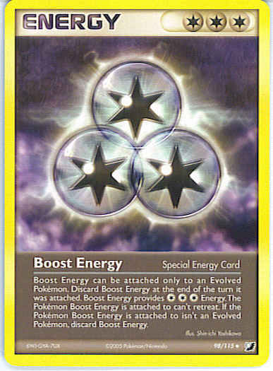Type | Energy | Pokemon serie | Unseen Forces | Stadie | Special Energy | Sjældenhed | Uncommon | Kortnummer | 98 | Evne | Boost Energy can be attached only to an Evolved Pokemon. Discard Boost Energy at the end of the turn it was attached. Boost Energy provides CCC Energy. The Pokemon Boost Energy is attached to can't retreat. If the Pokemon Boost Energy is attached to isn't an Evolved Pokemon, discard Boost Energy. | Evne2 | Boost Energy can be attached only to an Evolved Pokemon. Discard Boost Energy at the end of the turn it was attached. Boost Energy provides CCC Energy. The Pokemon Boost Energy is attached to can't retreat. If the Pokemon Boost Energy is attached to isn't an Evolved Pokemon, discard Boost Energy. | Kunstner | Shin-Ichi Yoshikawa |