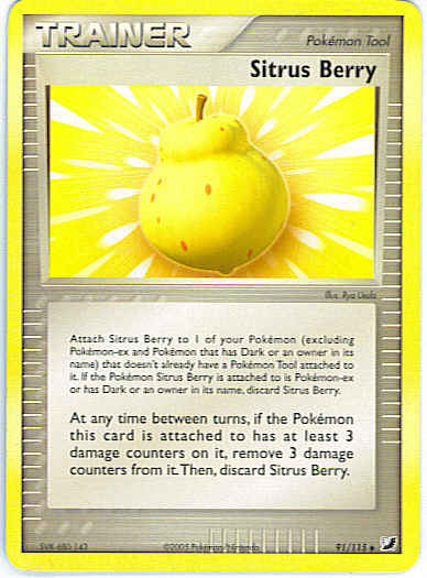 At any time between turns, if the Pokemon this card is attached to has at least 3 damage counters on it, remove 3 damage counters from it. Then, discard Sitrus Berry.