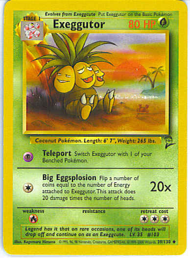[C] Big Eggsplosion (20x) Flip a number of coins equal to the number of Energy attached to Exeggutor. This attack does 20 damage times the number of heads.