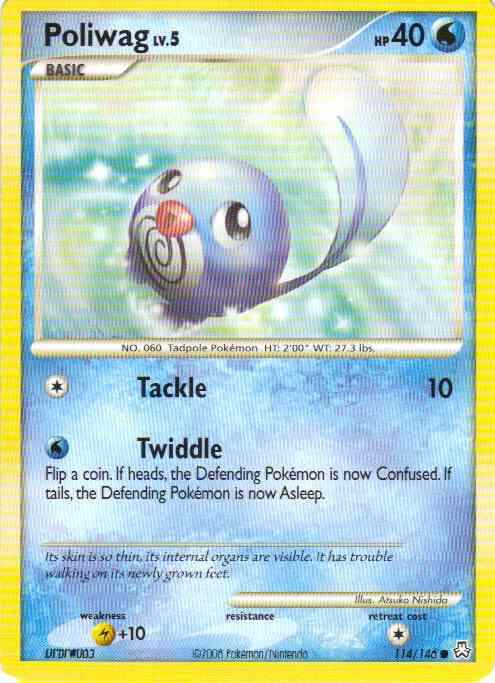 Type | Water | Pokemon serie | Legends Awakened | Stadie | Basic | HP | 40.0 | Sjældenhed | Common | Tilbagetrækning | 1.0 | Svaghed | L+10 | Kortnummer | 114 | Evne |