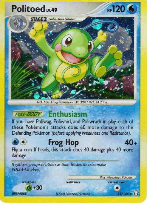 Type | Water | Pokemon serie | Legends Awakened | Stadie | Stage 2 | HP | 120.0 | Sjældenhed | Rare | Tilbagetrækning | 1.0 | Svaghed | G+30 | Kortnummer | 12 | Evne | [CW] Frog Hop (40+) Flip a coin. If heads, this attack does 40 damage plus 40 more damage.