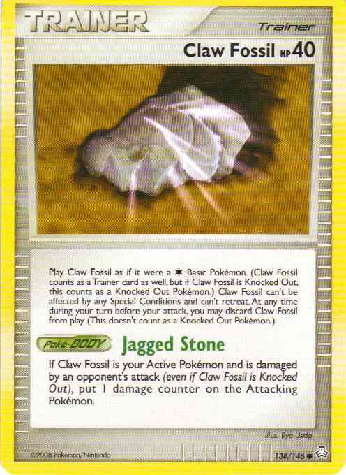 Play Claw Fossil as if it were a Basic Pokemon. (Claw Fossil counts as a Trainer card as well, but if Claw Fossil is Knocked Out, this counts as a Knocked Out Pokemon.) Claw Fossil can't be affected by any Special Conditions and can't retreat. At any time during your turn before your attack, you may discard Claw Fossil from play. (This doesn't count as a Knocked Out Pokemon.)