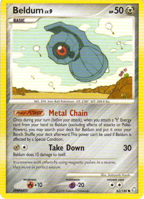 Type | Metal | Pokemon serie | Legends Awakened | Stadie | Basic | HP | 50.0 | Sjældenhed | Common | Tilbagetrækning | 2.0 | Modstand | P-20 | Svaghed | R+10 | Kortnummer | 83 | Evne | of attacks or Poke-Powers), you may search your deck for Beldum and put it onto your Bench. Shuffle your deck afterward. This power can't be used if Beldum is affected by a Special Condition. (Poke-POWER)