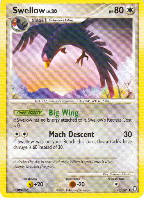 Type | Colorless | Pokemon serie | Legends Awakened | Stadie | Stage 1 | HP | 80.0 | Sjældenhed | Uncommon | Tilbagetrækning | 1.0 | Modstand | F-20 | Svaghed | L+20 | Kortnummer | 73 | Evne | [CC] Mach Descent (30) If Swellow was on your Bench this turn, this attack's base damage is 60 instead of 30.