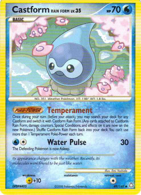 | Evne2 | on it are now on the new Pokemon.) Shuffle Castform Rain Form back into your deck. You can't use more than 1 Temperament Poke-Power each turn. (Poke-POWER)