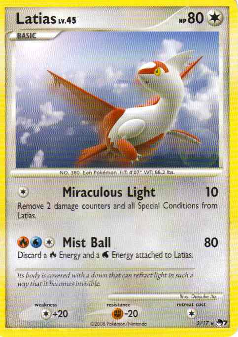 | Evne2 | [C] Miraculous Light (10) Remove 1 damage counter and all Special Conditions from Latias. [CRW] Mist Ball (80) Discard a R Energy and a W Energy attached to Latias.