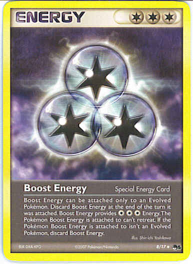 Evne Boost Energy can be attached only to an Evolved Pokemon. Discard Boost Energy at the end of the turn it was attached. Boost Energy provides CCC Energy. The Pokemon Boost Energy is attached to can't retreat. If the Pokemon Boost Energy is attached to isn't an Evolved Pokemon, discard Boost Energy.