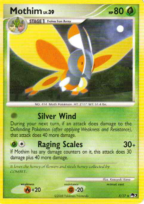 Type | Grass | Pokemon serie | OP Series 7 | Stadie | Stage 1 | HP | 80.0 | Sjældenhed | Rare | Tilbagetrækning | 0.0 | Modstand | F-20 | Svaghed | R+20 | Kortnummer | 5 | Evne | [0] Silver Wind - During your next turn, if an attack does damage to the Defending Pokemon (after applying Weakness and Resistance), that attack does 40 more damage. [CG] Raging Scales (30+) If Mothim has any damage counters on it, this attack does 30 damage plus 40 more damage.