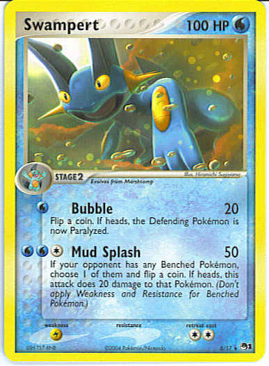 Type | Water | Pokemon serie | OP Series 1 | Stadie | Stage 2 | HP | 100 | Sjældenhed | Rare | Tilbagetrækning | 2 | Svaghed | L | Kortnummer | 5 | Evne | [W] Bubble (20) Flip a coin. If heads, the Defending Pokemon is now Paralyzed. [CWW] Mud Splash (50) If your opponent has any Benched Pokemon, choose 1 of them and flip a coin. If heads, this attack does 20 damage to that Pokemon. (Don't apply Weakness and Resistance for Benched Pokemon.)