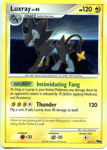 Type | Lightning | Pokemon serie | OP Series 8 | Stadie | Stage 2 | HP | 120.0 | Sjældenhed | Rare | Tilbagetrækning | 1.0 | Modstand | M-20 | Svaghed | F+30 | Kortnummer | 3 | Evne | [CLLL] Thunder (120) Flip a coin. If tails, Luxray does 40 damage to itself.