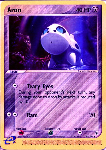 Type | Metal | Pokemon serie | Ruby Sapphire | Stadie | Basic | HP | 40 | Sjældenhed | Common | Tilbagetrækning | 1 | Modstand | G | Svaghed | R | Kortnummer | 49 | Evne | [C] Teary Eyes - During your opponent's next turn, any damage done to Aron is reduced by 10. [CC] Ram (20)