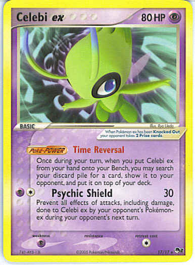Type | Psychic | Pokemon serie | OP Series 2 | Stadie | Basic | HP | 80 | Sjældenhed | Ultra-Rare | Tilbagetrækning | 1 | Svaghed | P | Kortnummer | 17 | Evne | [CP] Psychic Shield (30) Prevent all effects of attacks, including damage, done to Celebi ex by your opponent's Pokemon-ex during your opponent's next turn.