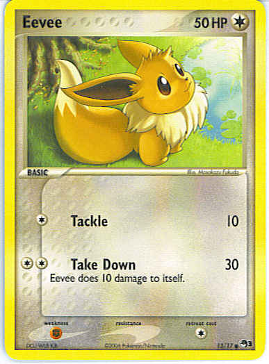 Type | Colorless | Pokemon serie | OP Series 3 | Stadie | Basic | HP | 50 | Sjældenhed | Common | Tilbagetrækning | 1 | Svaghed | F | Kortnummer | 13 | Evne | [C] Tackle (10) [CC] Take Down (30) Eevee does 10 damage to itself.