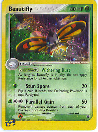 Type | Grass | Pokemon serie | Ruby Sapphire | Stadie | Stage 2 | HP | 80 | Sjældenhed | Rare | Svaghed | R | Kortnummer | 2 | Evne | [G] Stun Spore (20) Flip a coin. If heads, the Defending Pokemon is now Paralyzed. [CCG] Parallel Gain (50) Remove 1 damage counter from each of your Pokemon including Beautifly.