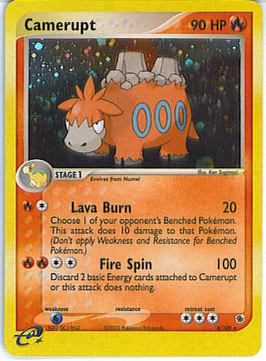 Type | Fire | Pokemon serie | Ruby Sapphire | Stadie | Stage 1 | HP | 90 | Sjældenhed | Rare | Tilbagetrækning | 3 | Svaghed | W | Kortnummer | 4 | Evne | [CR] Lava Burn (20) Choose one of your opponent's Benched Pokemon. This attack does 10 damage to that Pokemon. (Don't apply weakness and resistance for Benched Pokemon.) [CCRR] Fire Spin (100) Discard 2 Basic Energy cards attached to Camerupt or this attack does nothing.