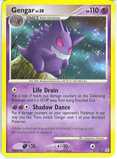 Type | Psychic | Pokemon serie | Diamond and Pearl | Stadie | Stage 2 | HP | 110 | Sjældenhed | Rare | Tilbagetrækning | 1 | Modstand | C-20 | Svaghed | D+30 | Kortnummer | 27 | Evne |