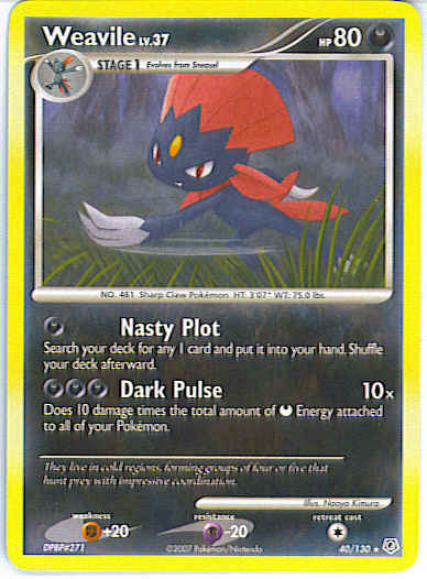 Type | Darkness | Pokemon serie | Diamond and Pearl | Stadie | Stage 1 | HP | 80 | Sjældenhed | Rare | Tilbagetrækning | 1 | Modstand | P-20 | Svaghed | F+20 | Kortnummer | 40 | Evne |
