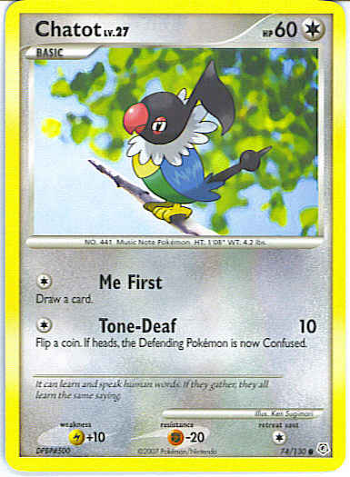 Type | Colorless | Pokemon serie | Diamond and Pearl | Stadie | Basic | HP | 60 | Sjældenhed | Common | Tilbagetrækning | 1 | Modstand | F-20 | Svaghed | L+10 | Kortnummer | 74 | Evne |