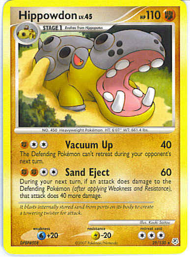 Type | Fighting | Pokemon serie | Diamond and Pearl | Stadie | Stage 1 | HP | 110 | Sjældenhed | Rare | Tilbagetrækning | 3 | Modstand | L-20 | Svaghed | W+20 | Kortnummer | 29 | Evne |