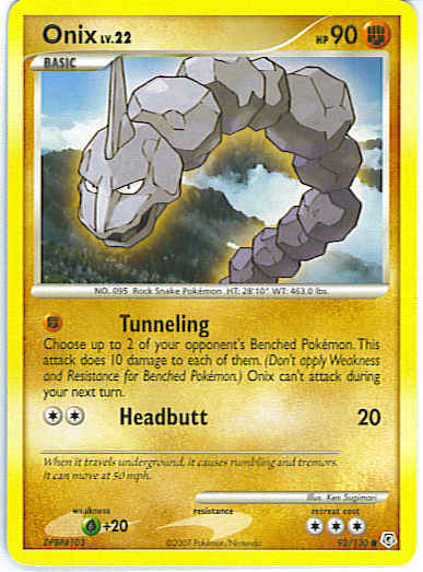 Evne [F] Tunneling - Choose up to 2 of your opponent's Benched Pokemon. This attack does 10 damage to each of them. (Don't apply Weakness and Resistance for Benched Pokemon.) Onix can't attack during your next turn.