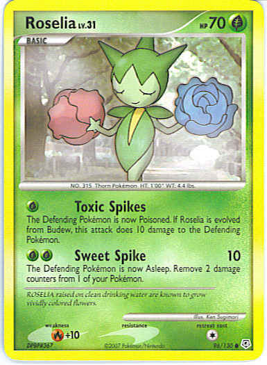 Evne [G] Toxic Spikes - The Defending Pokemon is now Poisoned. If Roselia is evolved from Budew, this attack does 10 damage to the Defending Pokemon.
