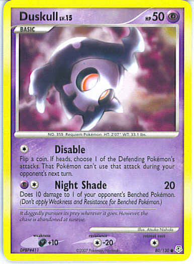Type | Psychic | Pokemon serie | Diamond and Pearl | Stadie | Basic | HP | 50 | Sjældenhed | Common | Tilbagetrækning | 1 | Modstand | C-20 | Svaghed | D+10 | Kortnummer | 80 | Evne |