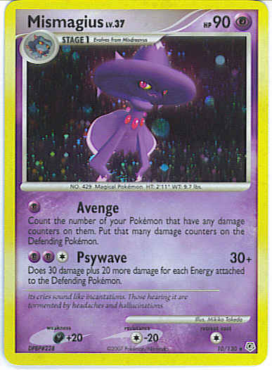 Type | Psychic | Pokemon serie | Diamond and Pearl | Stadie | Stage 1 | HP | 90 | Sjældenhed | Rare | Tilbagetrækning | 1 | Modstand | C-20 | Svaghed | D+20 | Kortnummer | 10 | Evne |