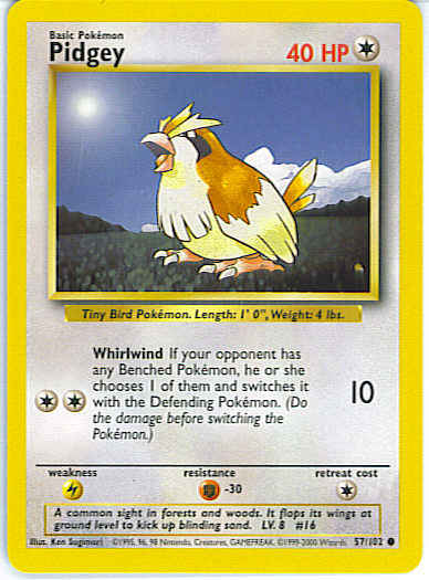 Type | Colorless | Pokemon serie | Base | Stadie | Basic | HP | 40 | Sjældenhed | Common | Tilbagetrækning | 1 | Modstand | F | Svaghed | L | Kortnummer | 57 | Evne |