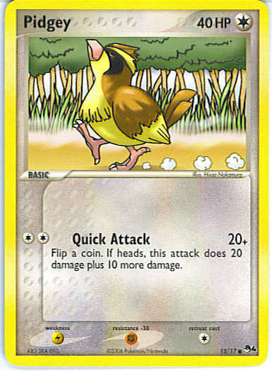 Type | Colorless | Pokemon serie | OP Series 4 | Stadie | Basic | HP | 40 | Sjældenhed | Common | Tilbagetrækning | 1 | Modstand | F | Svaghed | L | Kortnummer | 12 | Evne | [CC] Quick Attack (20+) Flip a coin. If heads, this attack does 20 damage plus 10 more damage.
