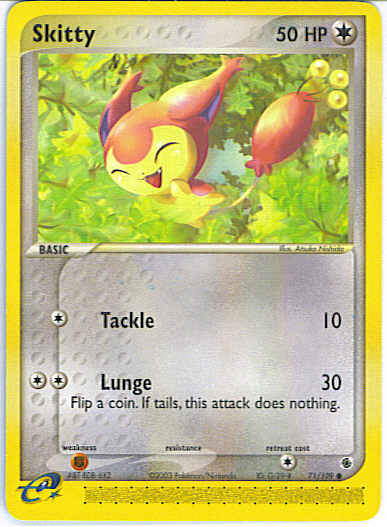 Type | Colorless | Pokemon serie | Ruby Sapphire | Stadie | Basic | HP | 50 | Sjældenhed | Common | Tilbagetrækning | 1 | Svaghed | F | Kortnummer | 71 | Evne | [C] Tackle (10) [CC] Lunge (30) Flip a coin. If tails, this attack does nothing.