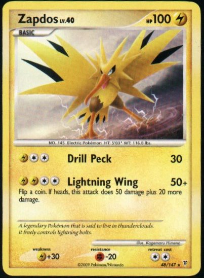 Type | Lightning | Pokemon serie | Supreme Victors | Stadie | Basic | HP | 100 | Sjældenhed | Rare | Tilbagetrækning | 2 | Modstand | F-20 | Svaghed | L+30 | Kortnummer | 48 | Evne |