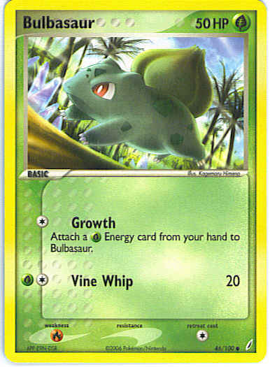 Type | Grass | Pokemon serie | Crystal Guardians | Stadie | Basic | HP | 50 | Sjældenhed | Common | Tilbagetrækning | 1 | Svaghed | R | Kortnummer | 46 | Evne | [C] Growth - Attach a G Energy card from your hand to Bulbasaur. [CG] Vine Whip (20) | Evne2 | [C] Growth - Attach a G Energy card from your hand to Bulbasaur. [CG] Vine Whip (20) | Kunstner | Kagemaru Himeno |