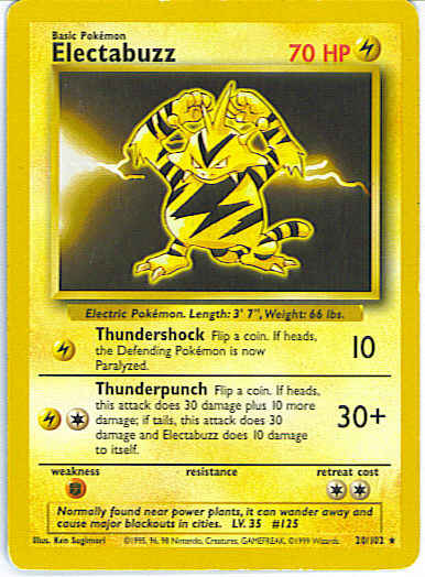 [CL] Thunderpunch (30+) Flip a coin. If heads, this attack does 30 damage plus 10 more damage. If tails, this attack does 30 damage and Electabuzz does 10 damage to itself.