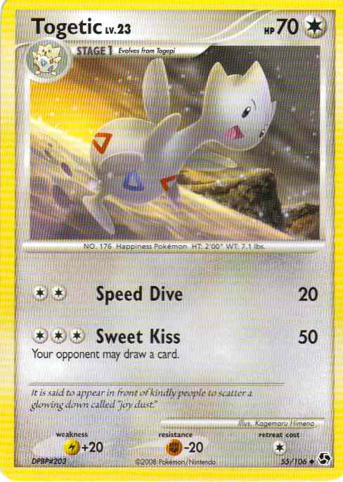 Type | Colorless | Pokemon serie | Great Encounters | Stadie | Stage 1 | HP | 70.0 | Sjældenhed | Uncommon | Tilbagetrækning | 1.0 | Modstand | F-20 | Svaghed | L+20 | Kortnummer | 55 | Evne | [CC] Speed Dive (20) [CCC] Sweet Kiss (50) Your opponent may draw a card.