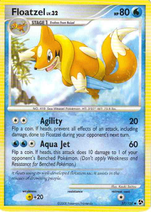Type | Water | Pokemon serie | Great Encounters | Stadie | Stage 1 | HP | 80.0 | Sjældenhed | Uncommon | Tilbagetrækning | 1.0 | Svaghed | L+20 | Kortnummer | 37 | Evne | [CC] Agility (20) Flip a coin. If heads, prevent all effects of an attack, including damage, done to Floatzel during your opponent's next turn. [CWW] Aqua Jet (60) Flip a coin. If heads, this attack does 10 damage to 1 of your opponent's Benched Pokemon. (Don't apply Weakness and Resistance for Benched Pokemon.)