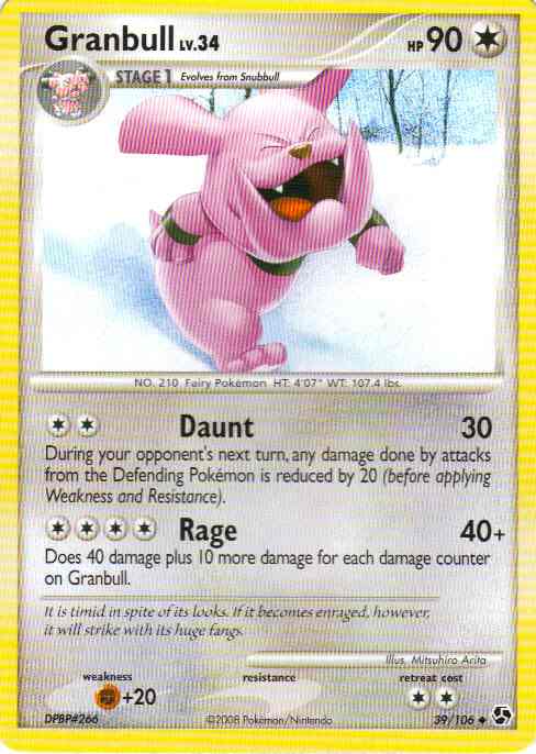 Type | Colorless | Pokemon serie | Great Encounters | Stadie | Stage 1 | HP | 90.0 | Sjældenhed | Uncommon | Tilbagetrækning | 2.0 | Svaghed | F+20 | Kortnummer | 39 | Evne | [CC] Daunt (30) During your opponent's next turn, any damage done by attacks from the Defending Pokemon is reduced by 20 (before applying Weakness and Resistance). [CCCC] Rage (40+) Does 40 damage plus 10 more damage for each damage counter on Granbull.