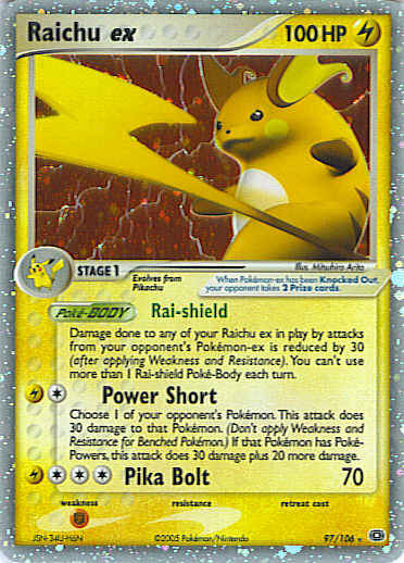 Type | Lightning | Pokemon serie | Emerald | Stadie | Stage 1 | HP | 100 | Sjældenhed | Ultra-Rare | Svaghed | F | Kortnummer | 97 | Evne | [CL] Power Short - Choose 1 of your opponent's Pokemon. This attack does 30 damage to that Pokemon. (Don't apply Weakness and Resistance for Benched Pokemon.) If that Pokemon has Poke-Powers, this attack does 30 damage plus 20 more damage. [CCCL] Pika Bolt (70) | Evne2 | [CL] Power Short - Choose 1 of your opponent's Pokemon. This attack does 30 damage to that Pokemon. (Don't apply Weakness and Resistance for Benched Pokemon.) If that Pokemon has Poke-Powers, this attack does 30 damage plus 20 more damage. [CCCL] Pika Bolt (70) | Kunstner | Mitsuhiro Arita |