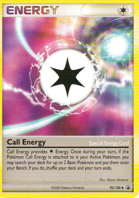 Call Energy provide C Energy. Once during your turn, if the Pokemon Call Energy is attached to is your Active Pokemon, you may search your deck for up to 2 Basic Pokemon and put them onto your Bench. If you do, shuffle your deck and your turn ends.