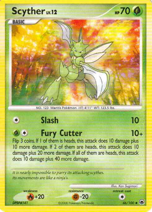 Type | Grass | Pokemon serie | Majestic Dawn | Stadie | Basic | HP | 70.0 | Sjældenhed | Uncommon | Tilbagetrækning | 1.0 | Modstand | F-20 | Svaghed | R+20 | Kortnummer | 46 | Evne | [C] Slash (10) [CG] Fury Cutter (10+) Flip 3 coins. If 1 of them is heads, this attack does 10 damage plus 10 more damage. If 2 of them are heads, this attack does 10 damage plus 20 more damage. If all of them are heads, this attack does 10 damage plus 40 more damage.