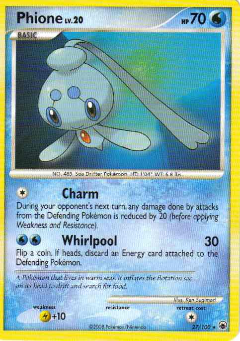 Type | Water | Pokemon serie | Majestic Dawn | Stadie | Basic | HP | 70.0 | Sjældenhed | Rare | Tilbagetrækning | 1.0 | Svaghed | L+10 | Kortnummer | 27 | Evne | [C] Charm - During your opponent's next turn, any damage done by attacks from the Defending Pokemon is reduced by 20 (before applying Weakness and Resistance). [WW] Whirlpool (30) Flip a coin. If heads, discard an Energy card attached to the Defending Pokemon.