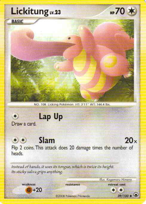 Type | Colorless | Pokemon serie | Majestic Dawn | Stadie | Basic | HP | 70.0 | Sjældenhed | Uncommon | Tilbagetrækning | 2.0 | Svaghed | F+20 | Kortnummer | 39 | Evne | [C] Lap Up - Draw a card. [CC] Slam (20x) Flip 2 coins. This attack does 20 damage times the number of heads.