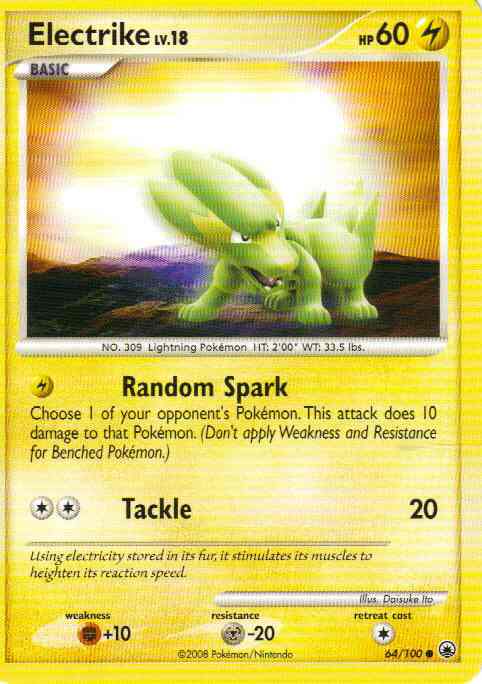 Type | Lightning | Pokemon serie | Majestic Dawn | Stadie | Basic | HP | 60.0 | Sjældenhed | Common | Tilbagetrækning | 1.0 | Modstand | M-20 | Svaghed | F+10 | Kortnummer | 64 | Evne |