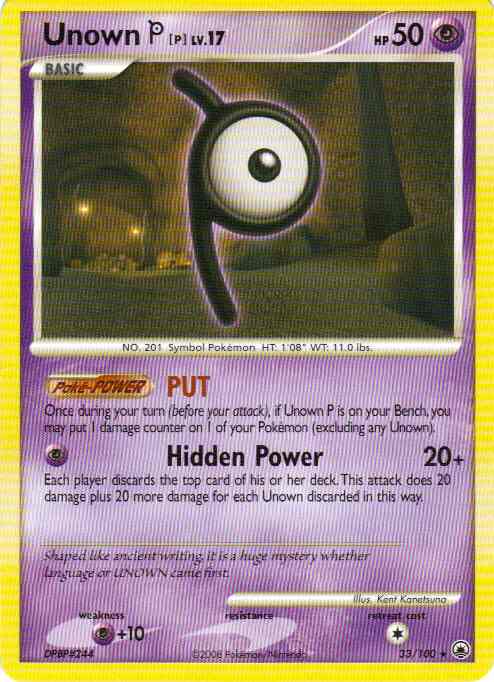 Type | Psychic | Pokemon serie | Majestic Dawn | Stadie | Basic | HP | 50.0 | Sjældenhed | Rare | Tilbagetrækning | 1.0 | Svaghed | P+10 | Kortnummer | 33 | Evne | [P] Hidden Power (20+) Each player discards the top card of his or her deck. This attack does 20 damage plus 20 more damage for each Unown discarded in this way.