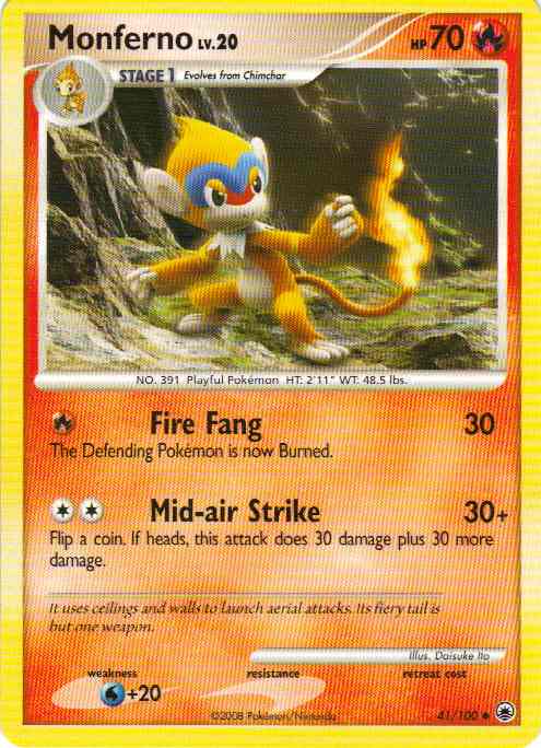 Type | Fire | Pokemon serie | Majestic Dawn | Stadie | Stage 1 | HP | 70.0 | Sjældenhed | Uncommon | Tilbagetrækning | 0.0 | Svaghed | W+20 | Kortnummer | 41 | Evne | [R] Fire Fang (30) The Defending Pokemon is now Burned. [CC] Mid-Air Strike (30+) Flip a coin. If heads, this attack does 30 damage plus 30 more damage.