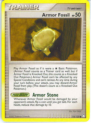 Play Armor Fossil as if it were a C Basic Pokemon. (Armor Fossil counts as a Trainer card as well, but if Armor Fossil is Knocked Out, this counts as a Knocked Out Pokemon.) Armor Fossil can't be affected by any Special Conditions and can't retreat. At any time during your turn before your attack, you may discard Armor Fossil from play. (This doesn't count as a Knocked Out Pokemon.)