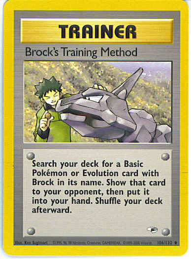 Search your deck for a Basic Pokemon or Evolution card with Brock in its name. Show that card to your opponent, then put it into your hand. Shuffle your deck afterward.
